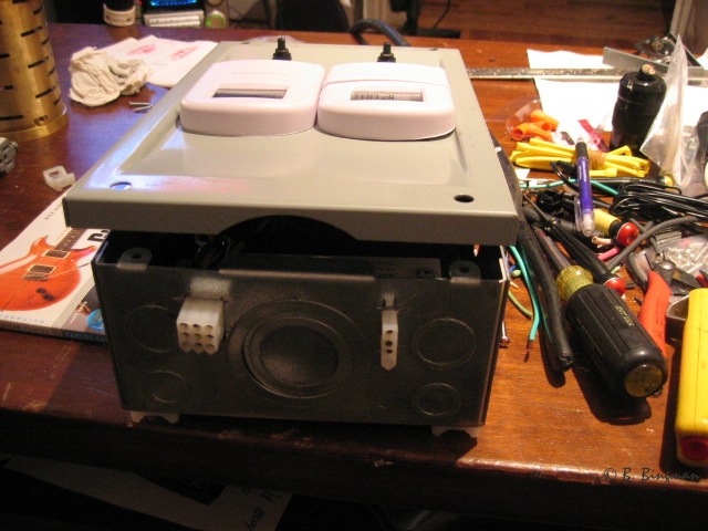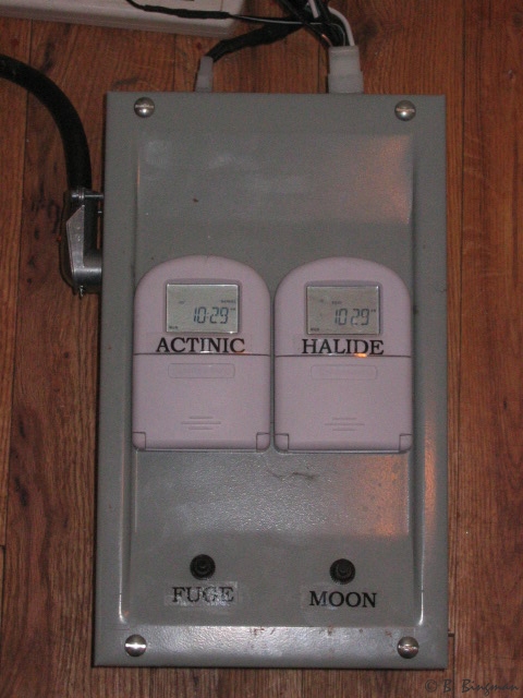 ![]() | I used my roto-zip to cut the holes for the timers. Next I drilled holes for the fuge and moonlight switches. |