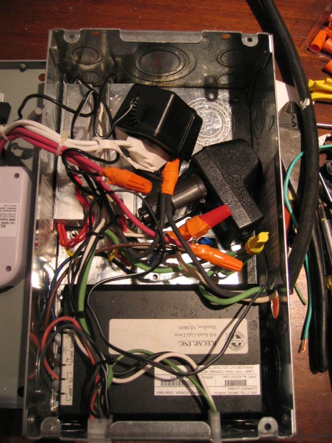 ![]() | 12Ga. wire soldered onto the power contacts. Black is Line, Red is Load from Relay, and White is Neutral |
